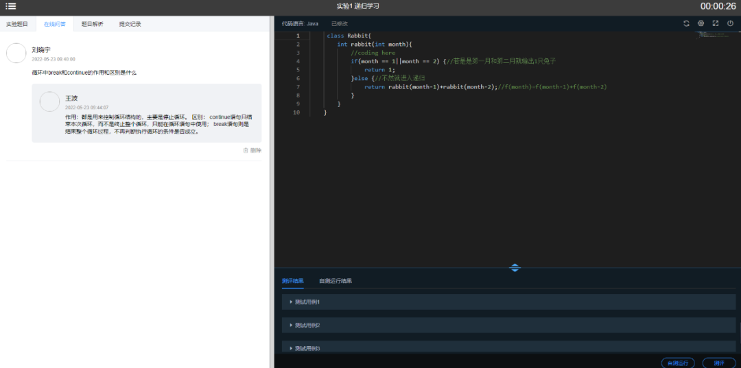 ③在线问答:Java程序设计虽对学生来说比较简单,但仍有些基础较差的学生可能会有问题,可采用在线问答向老师寻求帮助,实现实验教学中的师生互动。