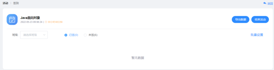 教师可通过签到、主题讨论、提问、分组任务、投票、问卷、计时器等课堂活动绑定“Java面向对象”教学课堂,配合教师讲授,发挥课堂中教师主导地位、学生主体地位,实现教学双边活动,提高教学效果。如教师发布签到活动,了解学生“Java面向对象”课堂到课情况。