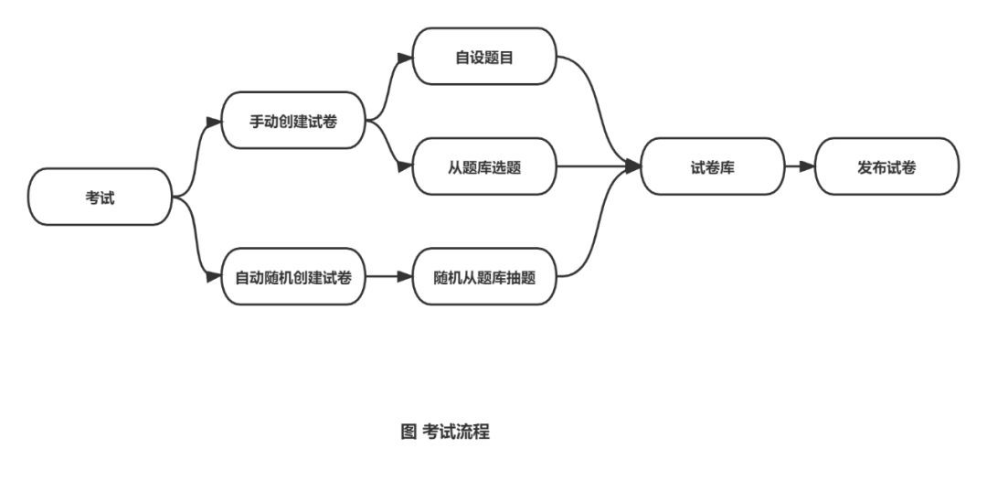 本学期的Java程序设计课程告一段落后,学生已基本掌握相关知识,教师可进行期末考试对学生学习成果进行检验,通过对学生考试情况的整体分析,为升学做好准备。考试流程如下图所示,教师采用手动或自动两种方式之一创建试卷,选取题目,创建完成的试卷自动进入试卷库后,教师从试卷库中发布试卷。