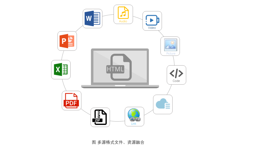 ②多源格式文件、资源融合:如下图所示,教师利用云课堂的课程制作工作,非常方便将视频、音频、超链接、编程代码、PPT、WORD、EXCEL、压缩文件、PDF等融合成一个新HTML文件中,从而构建“我的课”。