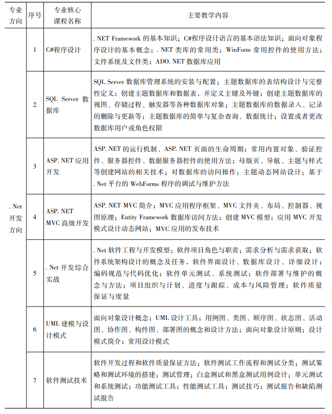 专业核心课程则是加强软件开发知识与其他相关应用知识的联系,培养掌握软件开发前后端数据交互、设计开发等知识,具备软件设计、开发、调试、维护等能力,能从事软件软件编程、软件测试、软件技术服务、智能终端界面开发等工作的中级技术技能人才;分为Java开发、.NET开发、Web前端开发三个方向,各方向之间可以实现课程共享。专业核心课内容如下:
