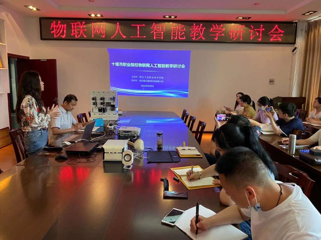 为深化产教融合,推动物联网、人工智能学科建设,人才培养,理论创新,技术突破和应用示范全方位发展,2022年6月9日下午,武汉唯众智创科技有限公司区域总监张菊,卓越工程师熊文辉赴湖北工业职业技术学院参加物联网人工智能教学研讨会,来自湖北工业职业技术学院、郧西县职业技术学校、十堰高级职业学校和湖北东风汽车技师学院等领导老师20余人参与其中。