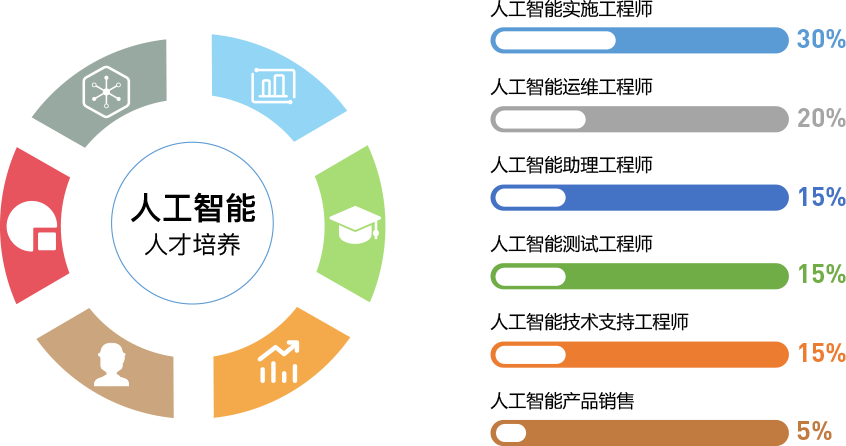 具体岗位包括:人工智能实施工程师(30%)、人工智能运维工程师(20%)、人工智能助理工程师(15%)、人工智能测试工程师(15%)、人工智能技术支持工程师(15%)、人工智能产品销售(5%)。