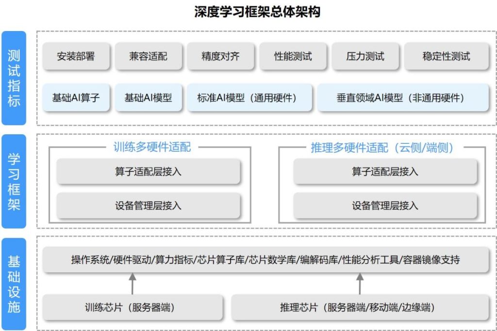 深度学习是机器学习的一种,机器学习是单层的,深度学习是多层的。计算机通过深度学习技术对数据信息进行总结、抽象,并发现其中的规律。在数据输入后,通过多层非线性的特征学习和分层特征提取,最终对输入的图像、声音等数据进行预测。深度学习框架多硬件平台适配总体架构技术方案包括设备管理层接入接口、算子适配层接入接口,训练框架与推理框架的多硬件适配指标体系包括安装部署、兼容适配、算子支持、模型支持、训练性能、稳定性和易扩展性等。