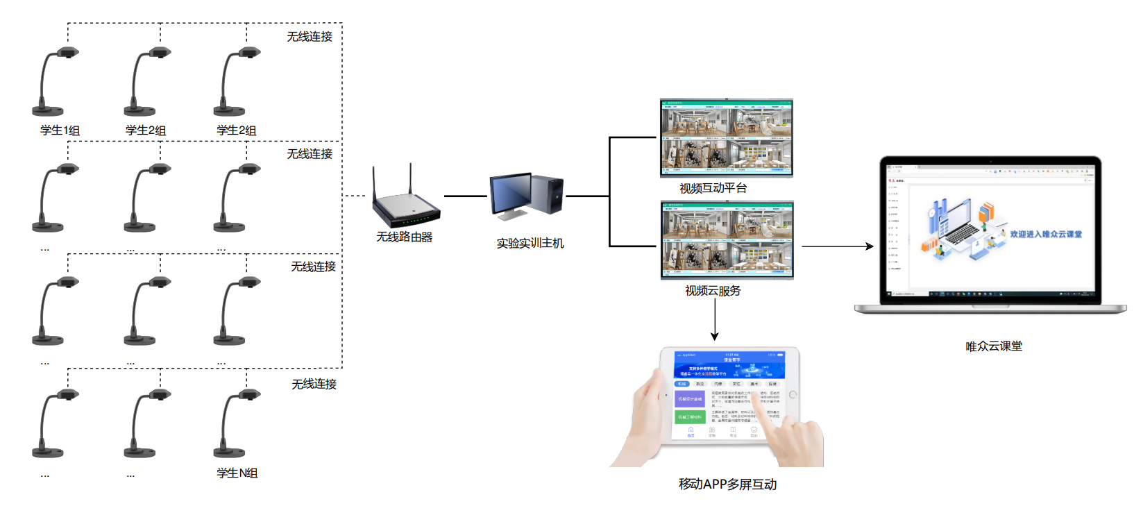 该系统具有移动性,可以应用于各类实训场景,包括烹饪实训室、化工实训室、护理实训室、中医实训室、汽车维修实训室、电子工程实训室、服装设计实训室、美术实训室、书法实训室、音乐实训室、绘画实训室、创客实训室等专业的实训教学。它建立了“学生学习,教师指导,资源管理”的实训教学模式,适用于不同专业的实际操作教学。