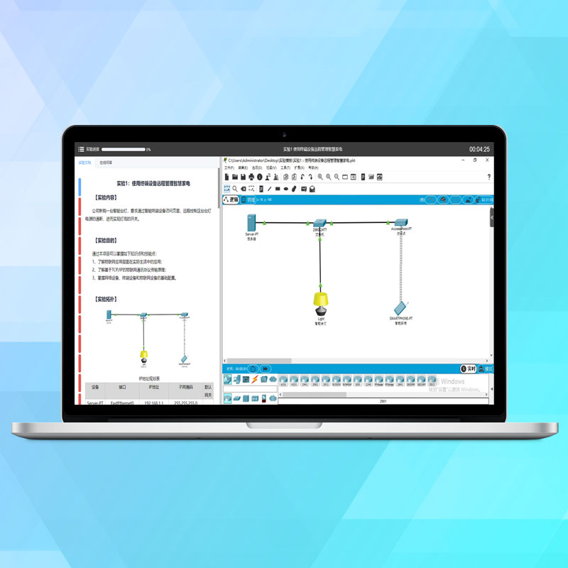 物联网仿真系统可以摆脱实际设备数量及实验室容量、课程时间安排等其他条件的限制,便于学生随时随地地进行实验,仿真环境中提供设备的多样性,这些设备包括常见的网关、执行器、传感器(温湿度、二氧化碳浓度、光照、空调、风机、运动检测器、声响检测器、气体检测器、风力检测器、光电探测器、金属传感器、RFID 以及电位器),系统还可以仿真UDP、TCP、HTTP、MQTT等联网通讯协议,非常方便创建智能家居、智能电网、智能交通、智能停车、智慧农业应用,并能对应用进行可视化管理。图形用户界面直接使用拖曳方法建立物联网拓扑结构, 并可以利用物联网设备进行配置和编程,还能实现了智能物联网在感知层、传输层 和应用层过程仿真。