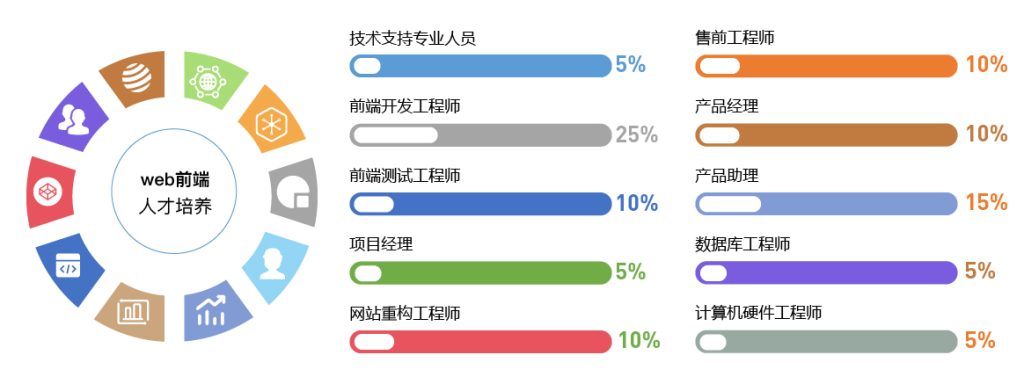 具体岗位包括:技术支持专业人员(5%)、前端开发工程师(25%)、前端测试工程师(10%)、项目经理(5%)、网站重构工程师(10%)、售前工程师(10%)、产品经理(10%)、产品助理(15%)、数据库工程师(5%)、计算机硬件工程师(5%)。