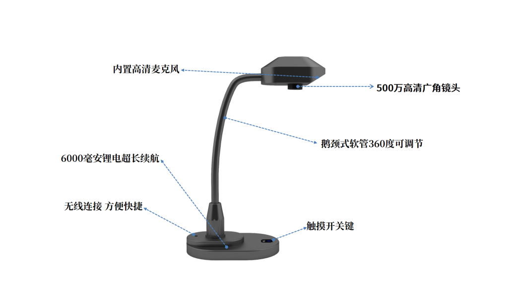 (3)音视频同步支持无线传输,360度视频采集,配备鹅颈式万向软管设计,实现随移随用,轻松部署,大大提高课程效率;