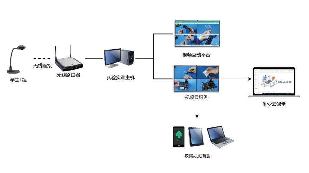 简易实训教学系统可通过无线接入手提笔记本,结合实训教学图像同步向学生传递,用于增强实训教学效果。