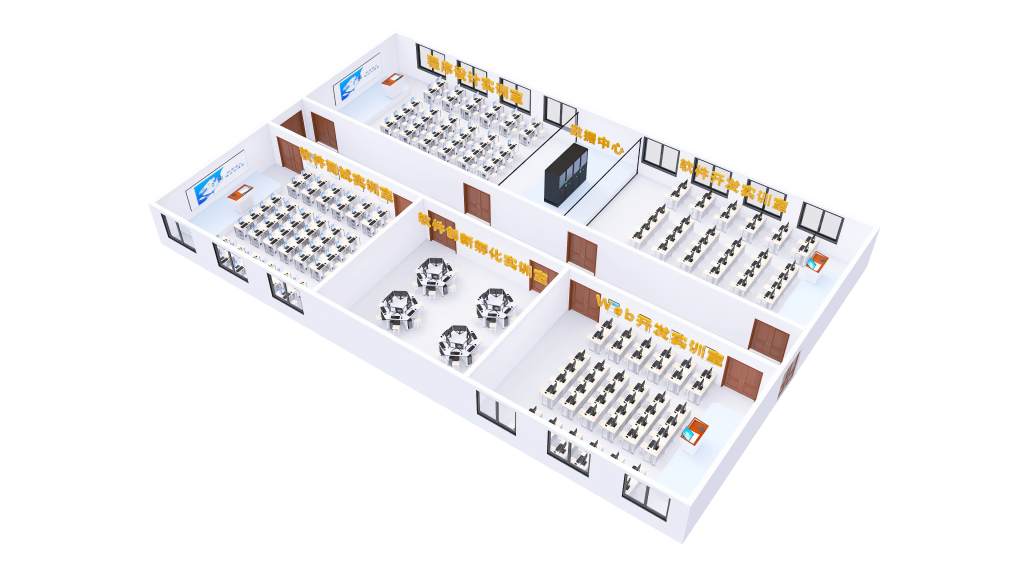 软件开发实训室配备计算机、服务器、交换机、网络机柜、多媒体中控台、投影仪、投影幕、电脑桌椅、交互式电子白板、操作系统软件办公软件、Java项目开发软件、Android 项目开发软件、数据库开发软件、前端开发软件、Python 项目开发软件、.Net 项目开发软件、项目管理软件。