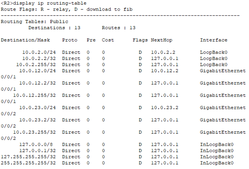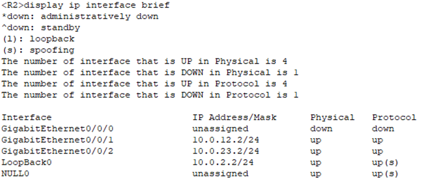 <Huawei>system-view [Huawei]sysname R2 [R2]interface GigabitEthernet 0/0/1 [R2-GigabitEthernet0/0/1]ip address 10.0.12.2 24 [R2-GigabitEthernet0/0/1]quit [R2]interface GigabitEthernet 0/0/2 [R2-GigabitEthernet0/0/2]ip address 10.0.23.2 24 [R2-GigabitEthernet0/0/2]quit [R2]interface LoopBack 0 [R2-LoopBack0]ip address 10.0.2.2 24
