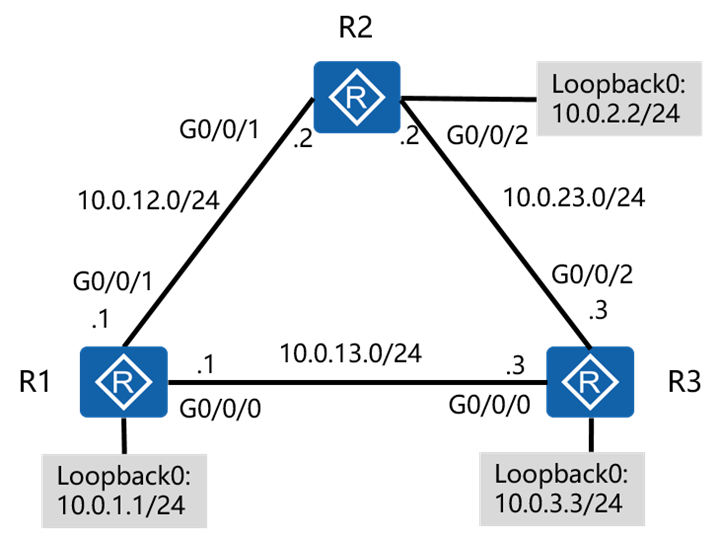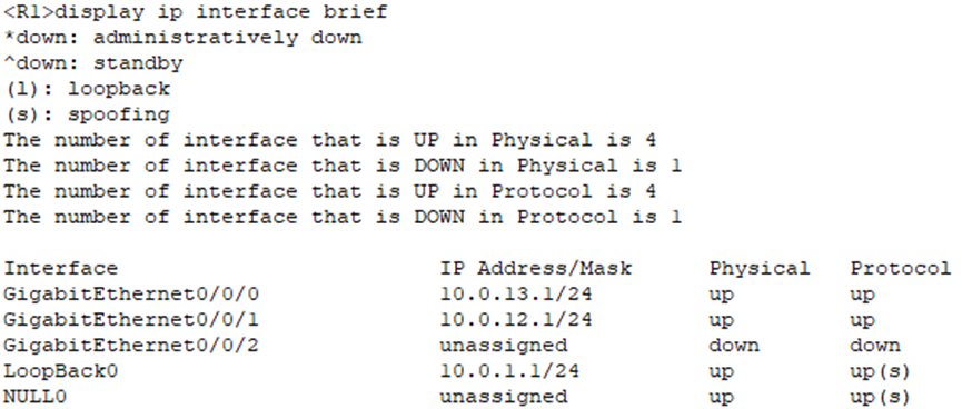 <Huawei>system-view [Huawei]sysname R1 [R1]interface GigabitEthernet 0/0/0 [R1-GigabitEthernet0/0/0]ip address 10.0.13.1 24 [R1-GigabitEthernet0/0/0]quit [R1]interface GigabitEthernet 0/0/1 [R1-GigabitEthernet0/0/1]ip address 10.0.12.1 24 [R1-GigabitEthernet0/0/1]quit [R1]interface LoopBack 0 [R1-LoopBack0]ip address 10.0.1.1 24