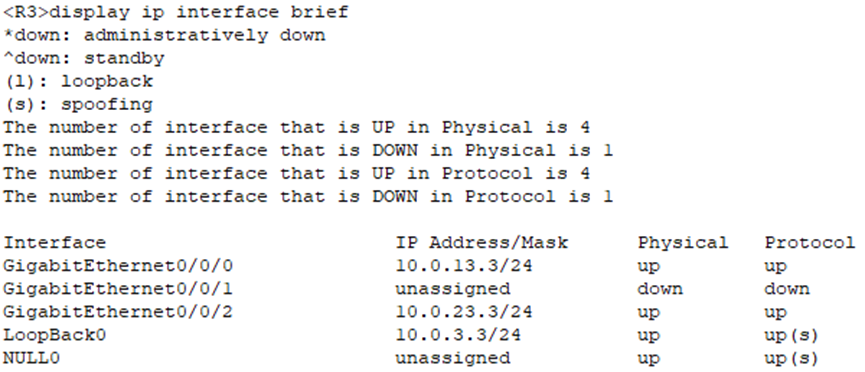 <Huawei>system-view [Huawei]sysname R3 [R3]interface GigabitEthernet 0/0/0 [R3-GigabitEthernet0/0/0]ip address 10.0.13.3 24 [R3-GigabitEthernet0/0/0]quit [R3]interface GigabitEthernet 0/0/2 [R3-GigabitEthernet0/0/2]ip address 10.0.23.3 24 [R3-GigabitEthernet0/0/2]quit [R3]interface LoopBack 0 [R3-LoopBack0]ip address 10.0.3.3 24