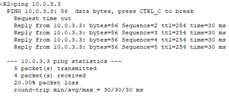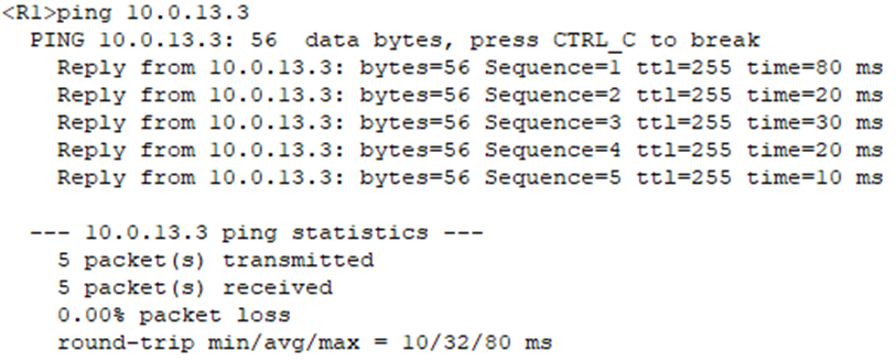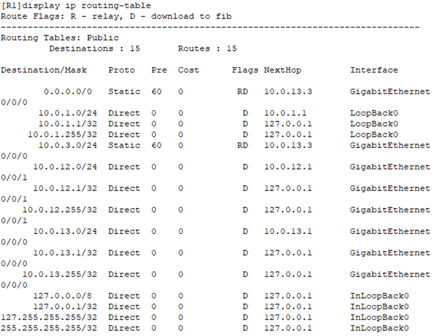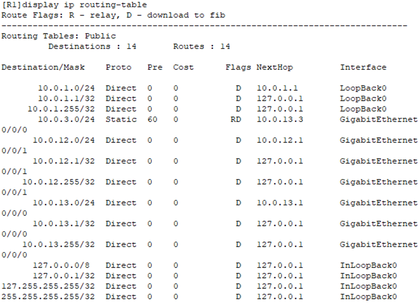 [R1]ip route-static 10.0.3.0 24 10.0.13.3