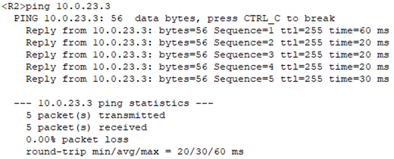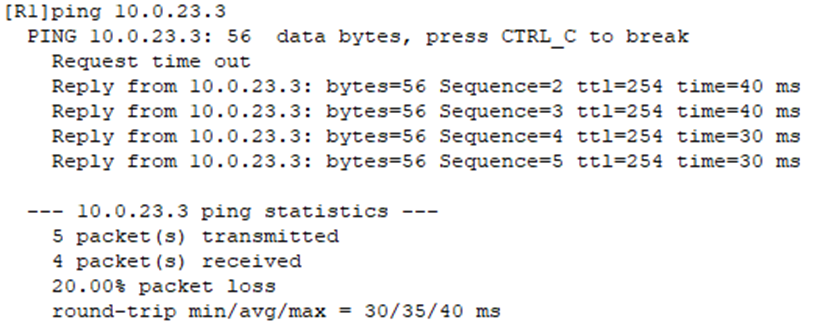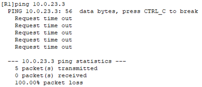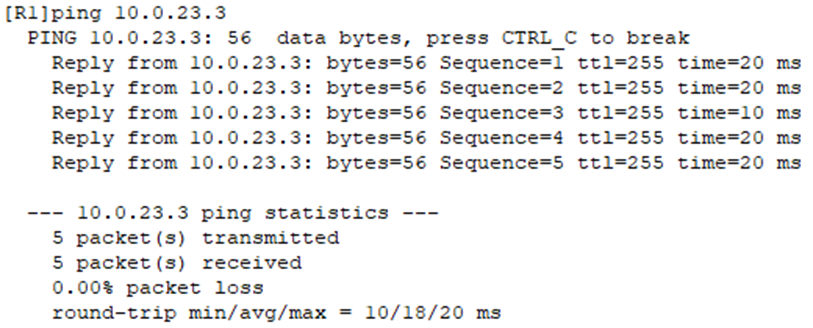 3、配置完成后,检测R1和10.0.23.3网络间的连通性。