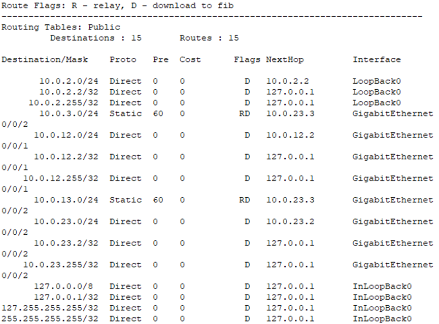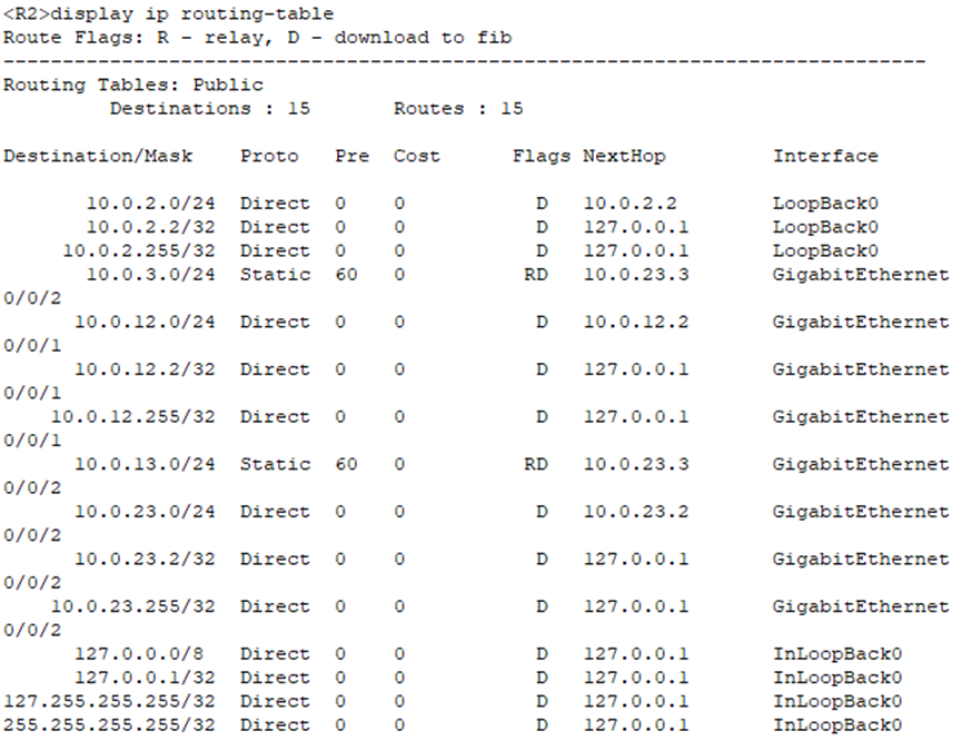 [R2]ip route-static 10.0.13.0 24 10.0.23.3 [R2]ip route-static 10.0.3.0 24 10.0.23.3 <R2>display ip routing-table