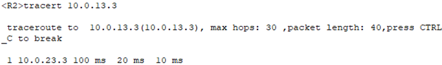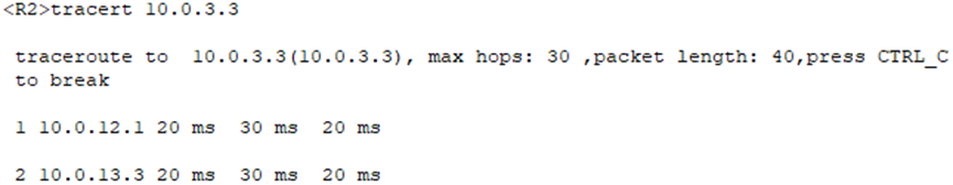 当R2和R3之间链路正常时,R2与网络10.0.13.3和10.0.3.3之间交互的数据通过R2与R3间的链路传输。执行tracert命令,可以查看数据的传输路径。