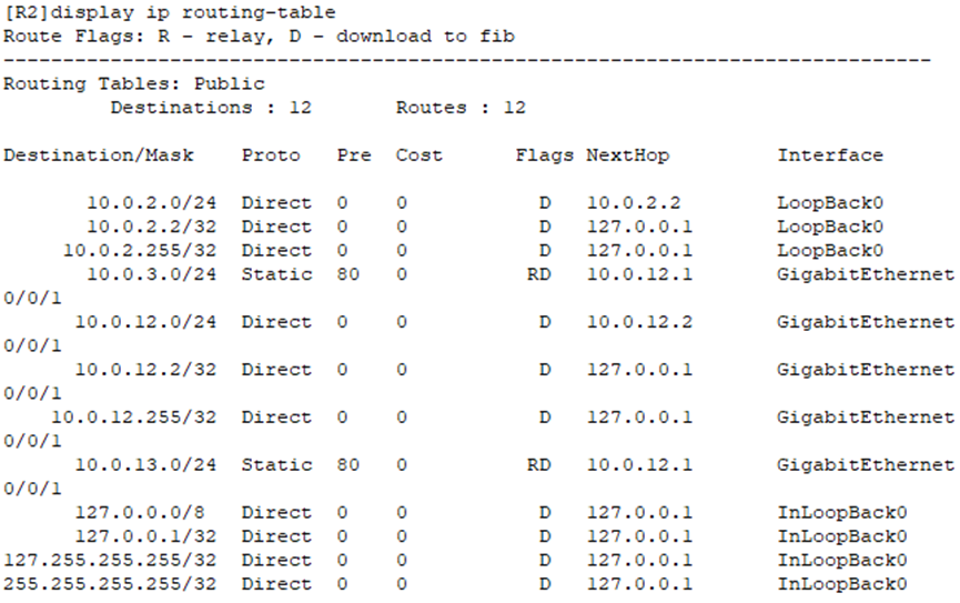 [R3]ip route-static 10.0.12.0 24 10.0.13.1