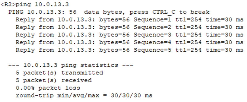 检测R2到目的地址10.0.13.3以及R3上的10.0.3.3的连通性。