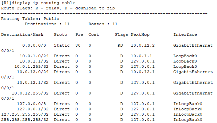 [R1]ip route-static 0.0.0.0 0.0.0.0 10.0.12.2 preference 80