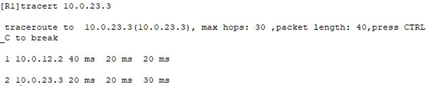 结果显示报文通过R2(10.0.12.2)到达R3(10.0.23.3)。
