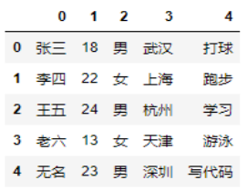 #创建DataFrame。 s1 = pd.Series(['张三', 18, '男', '武汉', '打球']) s2 = pd.Series(['李四', 22, '女', '上海', '跑步']) s3 = pd.Series(['王五', 24, '男', '杭州', '学习']) s4 = pd.Series(['老六', 13, '女', '天津', '游泳']) s5 = pd.Series(['无名', 23, '男', '深圳', '写代码']) df1 = pd.DataFrame([s1,s2,s3,s4,s5]) df1
