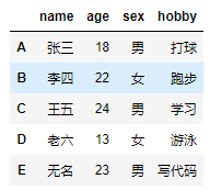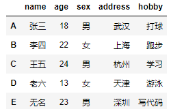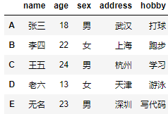 #修改索引名和列名。 df1.index= ['A', 'B', 'C', 'D', 'E'] df1.columns = ['name', 'age', 'sex', 'address', 'hobby'] df1