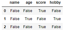 #isnull判断是否为缺失值,是则返回True,否则返回False。 df.isnull()