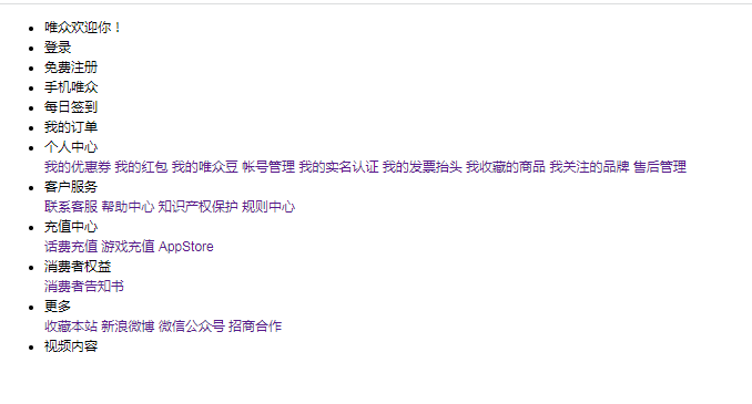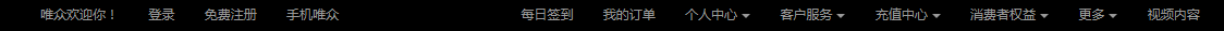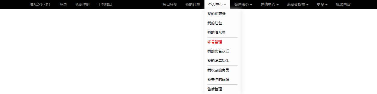 <!DOCTYPE html> <html lang="en"> <head> <meta charset="UTF-8"> <meta http-equiv="X-UA-Compatible" content="IE=edge"> <meta name="viewport" content="width=device-width, initial-scale=1.0"> <!-- 这里是引入我们将要编辑的css样式表 --> <link rel="stylesheet" href="index.css"> <title>唯众海购网</title> </head> <body> <div id="topNav"> <!-- nav标签用来定义导航链接的部分 --> <nav> <!-- 根据刚才第一步的分析可以知道这是一个水平导航栏,我们可以采用ul > li 的格式来建立一个导航栏列表 --> <!-- 这里定义一个类名为Nav方便之后用CSS以类名Nav所在的标签为父级标签对导航栏进行样式操作 --> <ul class="Nav"> <li>唯众欢迎你!</li> <li><a>登录</a></li> <li><a>免费注册</a></li> <li><a>手机唯众</a></li> <li><a>每日签到</a></li> <li><a>我的订单</a></li> <li><a>个人中心<i></i></a> <!-- 这里面有个类名为personalCenter的div标签,取名为该类名的原因是,该类名中文翻译为个人中心 --> <!-- 这个div标签是嵌套在li里面的,之后用于表示二级下拉菜单栏 --> <div class="personalCenter"> <a href="">我的优惠券</a> <a href="">我的红包</a> <a href="">我的唯众豆</a> <a href="">帐号管理</a> <a href="">我的实名认证</a> <a href="">我的发票抬头</a> <a href="">我收藏的商品</a> <a href="">我关注的品牌</a> <a href="">售后管理</a> </div> </li> <li><a>客户服务<i></i></a> <!-- 这里面有个类名为customerService的div标签,取名为该类名的原因是,该类名中文翻译为客服服务 --> <!-- 这个div标签是嵌套在li里面的,之后用于表示二级下拉菜单栏 --> <div class="customerService"> <a href="">联系客服</a> <a href="">帮助中心</a> <a href="">知识产权保护</a> <a href="">规则中心</a> </div> </li> <li><a>充值中心<i></i></a> <!-- 这里面有个类名为payCenter的div标签,取名为该类名的原因是,该类名中文翻译为支付中心 --> <!-- 这个div标签是嵌套在li里面的,之后用于表示二级下拉菜单栏 --> <div class="payCenter"> <a href="">话费充值</a> <a href="">游戏充值</a> <a href="">AppStore</a> </div> </li> <li><a>消费者权益<i></i></a> <!-- 这里面有个类名为consumesInterests的div标签,取名为该类名的原因是,该类名中文翻译为消费者权益 --> <!-- 这个div标签是嵌套在li里面的,之后用于表示二级下拉菜单栏 --> <div class="consumesInterests"> <a href="">消费者告知书</a> </div> </li> <li><a>更多<i></i></a> <!-- 这里面有个类名为more的div标签,取名为该类名的原因是,该类名中文翻译为更多 --> <!-- 这个div标签是嵌套在li里面的,之后用于表示二级下拉菜单栏 --> <div class="more"> <a href="">收藏本站</a> <a href="">新浪微博</a> <a href="">微信公众号</a> <a href="">招商合作</a> </div> </li> <li><a>视频内容</a></li> </ul> </nav> </div> </body> </html>