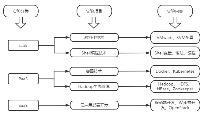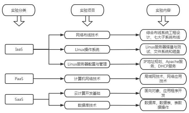 由于云计算知识体系的庞杂性、应用性、实践性等特点,实验室和实训基地在教学过程中起的作用远比其他学科重要。在进行基本理论知识教学之后,实验室能够提供给学生动手实践的平台,将理论知识转为实际操作;为学生提供一个真实的实训环境。结合企业人才需求,从IaaS、PaaS、SaaS三个角度为专业学科建设提供软硬件平台及教学实验环境的支撑。