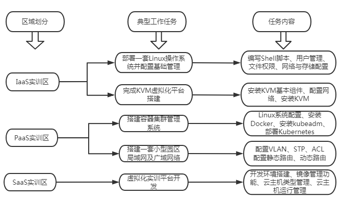 IaaS实训区:满足云计算技术应用专业基础设施的实验学习,覆盖网络布线、虚拟化、Shell的教学实验