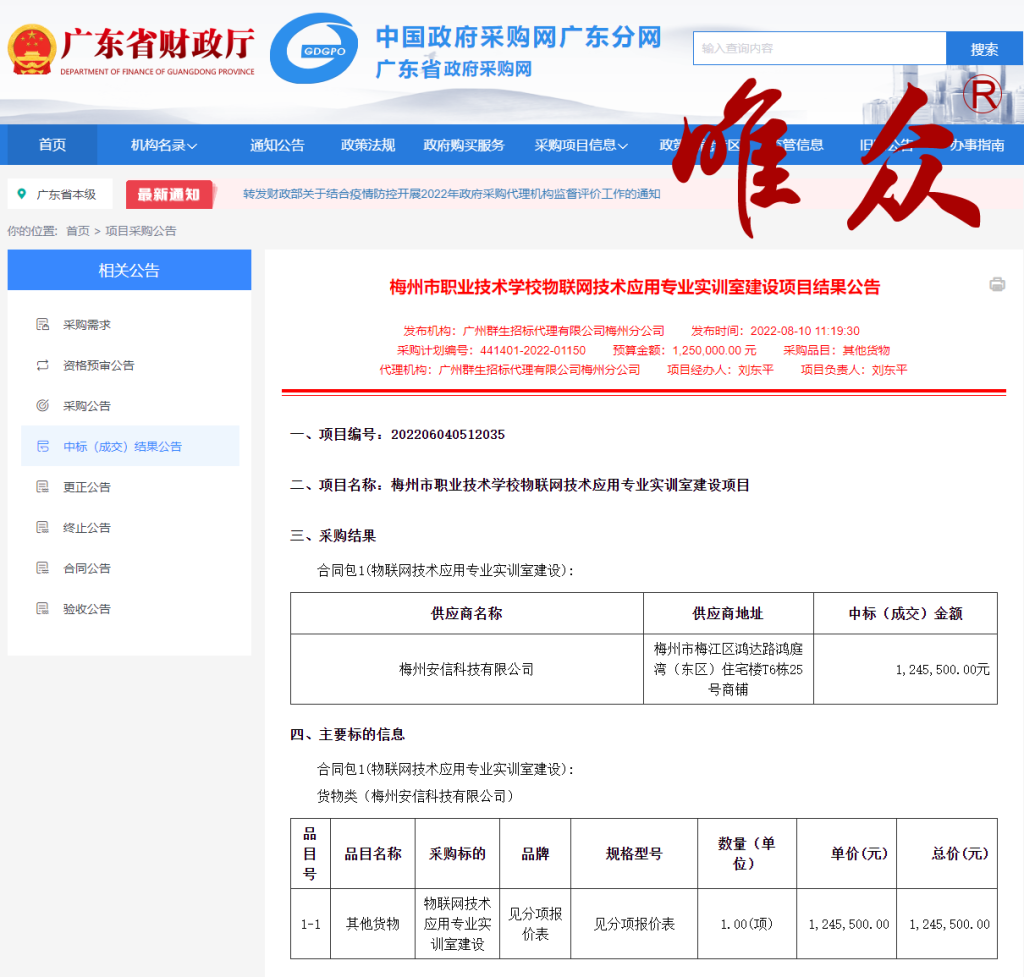 唯众与合作伙伴共同携手中标梅州市职业技术学校物联网技术应用专业实训室建设项目,唯众物联网实训室的中标,为梅州市职业技术学校学生技能提升、促进就业提供了强有力的支撑和保障。