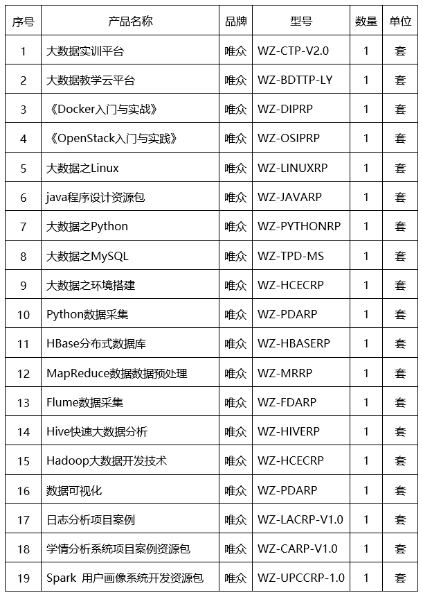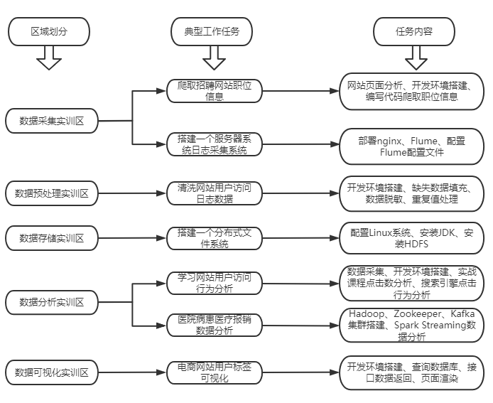 大数据技术应用专业的培养目标是培养掌握大数据基础理论知识、掌握大数据平台搭建、数据采集与预处理、数据存储和数据分析及可视化等知识和技能、动手能力强、适应各种岗位工作的复合应用型人才,从事数据爬取、数据清洗、系统搭建、系统维护、解决方案设计等工作。由于大数据知识体系的庞杂性、应用性、实践性等特点,实验室和实训基地在教学过程中起的作用远比其他学科来得重要。在进行基本理论知识教学之后,实验室能够提供给学生动手实践的平台,将理论知识转为实际操作。结合企业人才需求,从数据采集、数据预处理、数据存储、数据分析、数据可视化“五维”角度为专业学科建设提供平台及教学实验环境的支撑。数据采集实训区:满足大数据技术应用专业数据采集的实验学习,覆盖计算机网络、网络爬虫、大数据采集技术的教学实验。数据预处理实训区:满足大数据技术应用专业数据预处理的实验学习,覆盖Scala、Java、大数据清洗与ETL技术的教学实验。数据存储实训区:满足大数据技术应用专业数据存储的实验学习,覆盖数据仓库、数据库、消息中间件的教学实验。数据分析实训区:满足大数据技术应用专业数据分析的实验学习,覆盖Python数据分析基础、Spark、Flink大数据分析的教学实验。数据可视化实训区:满足大数据技术应用专业数据可视化的实验学习,覆盖网页图表制作与可视化、Python数据可视化、可视化工具的教学实验。