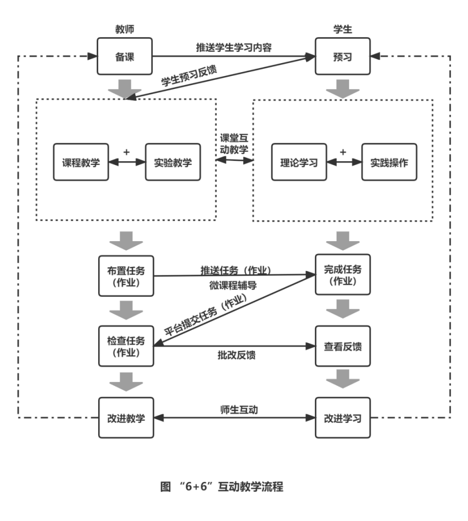 云课堂是唯众凭借十多年在职业教学领域耕耘,以“微服务、虚拟化、全栈云”三大核心技术为支撑,助力学校高水平专业建设。该平台采用微服务架构,将平台服务精准分为公共基础、公共应用、专业应用服务。公共基础服务精确为字典、banner、用户权限、文件、认证、网关、订单、转码、平台运营、学校运营、日志、登录、搜索等;专业应用服务精确为KVM虚拟化、容器虚拟化、代码评测、工具、资源、环境等;公共应用服务精确为课程、考试服务、云盘、云优选、题库、活动、工具等。不同的微服务进行因材施教和按需施教,可以非常方便教师实施个性化的教学模式、具体的教学内容、针对性的教学流程,精细赋能Web前端框架应用教学。老师利用平台非常方便构建多层次、立体化的教学课程资源,拓宽了学习渠道,极大地调动了学生参与学习的积极性,提高了教学效率,实现了老师在家、在办公室、在教室都可轻松进行无差异环境备课,实现了与学生的“课前”“课中”“课后”和校内校外有机结合的网络在线学习、在线实践操作,并逐步形成课堂教学与云教学相结合的混合式教学模式。该平台在教学中的应用,打破了校园时空限制、教学环境限制,可实现学生的远程学习和弹性自主学习,远程实训和弹性自主学训。唯众云课堂充分利用KVM和容器等多种虚拟化技术进行精准化教学,根据不同的教学内容选用不同的虚拟化技术、不同硬件资源,如GPU、CPU、算力、不同的实验环境,对不同软件开发语言(C、Java、Python、html等)、同一课程的不同阶段开展精细化教学。唯众云课堂还可根据教学的需求进行公有云、私有云、混合云等不同方式的部署,可以适应学校各种不同的复杂网络环境和资产入库需求而且性价比高、稳定性强。平台还将科研、技能大赛、1+X认证等全流程无缝衔接各种计算机网络、智能化安防、物联网、人工智能等前端应用场景,更加高效开展具有多种功能的开放式、全流程、理实一体化的Web前端教学平台。基于唯众云课堂的“6+6”互动教学流程如下图所示。