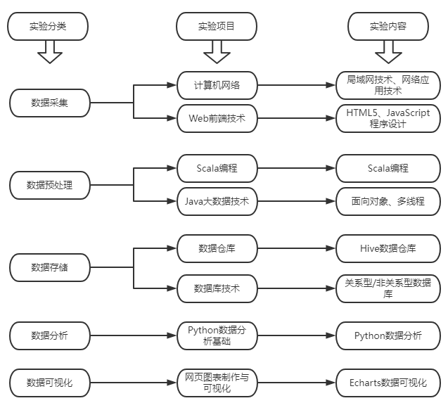 大数据技术应用专业核心实践教学内容:要在理论学习的基础上突出综合运用能力的培养,围绕大数据基础技术及专业方向,设立多样化的实验项目。注重培养团队精神以及创新能力的培养,强化培养学生的创新能力,科研素养和团队协调能力。针对每一门专业核心课程,结合相对应的课程设计,以此达到巩固学生的学习成果以及提高学生实践能力。