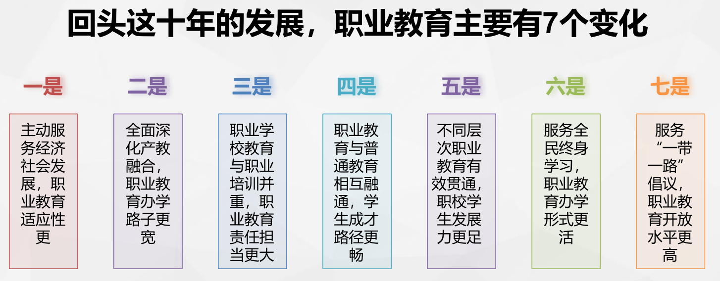 十年来,中职、高职专科和职业本科一体化学校体系基本建立,中职的基础地位进