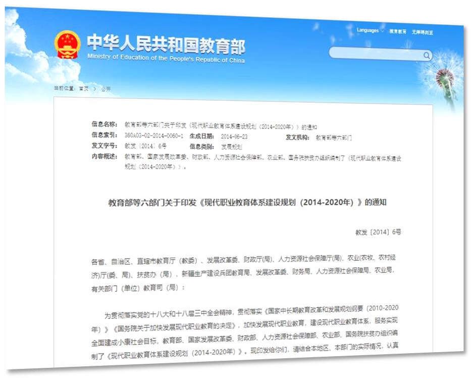 2014年,国务院召开全国职业教育工作会议,出台《关于加快发展现代职业教育的决定》,教育部等六部门印发《现代职业教育体系建设规划(2014-2020年)》,以体系建设为抓手,推动职业教育从规模扩张向内涵发展。