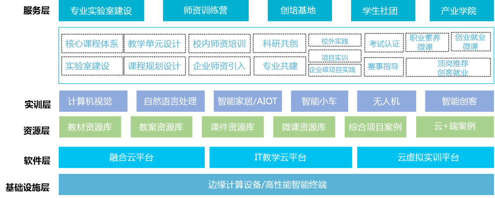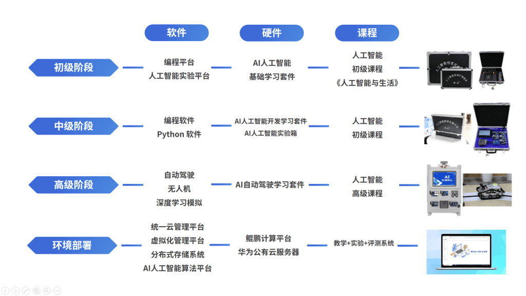 - 根据学生认知水平,应用 AI 实现四要素包括算力、算法、数据、场景,通过人工智能实验室软硬件方案,学生可以理解、掌握 AI 实现的方法和全过程,发挥自身的想象、创造力。