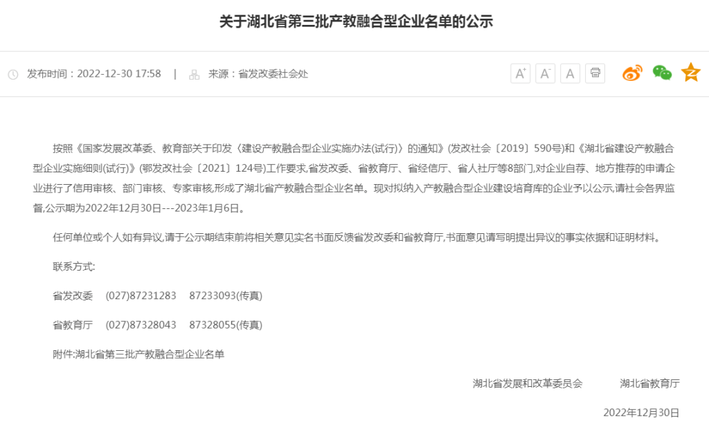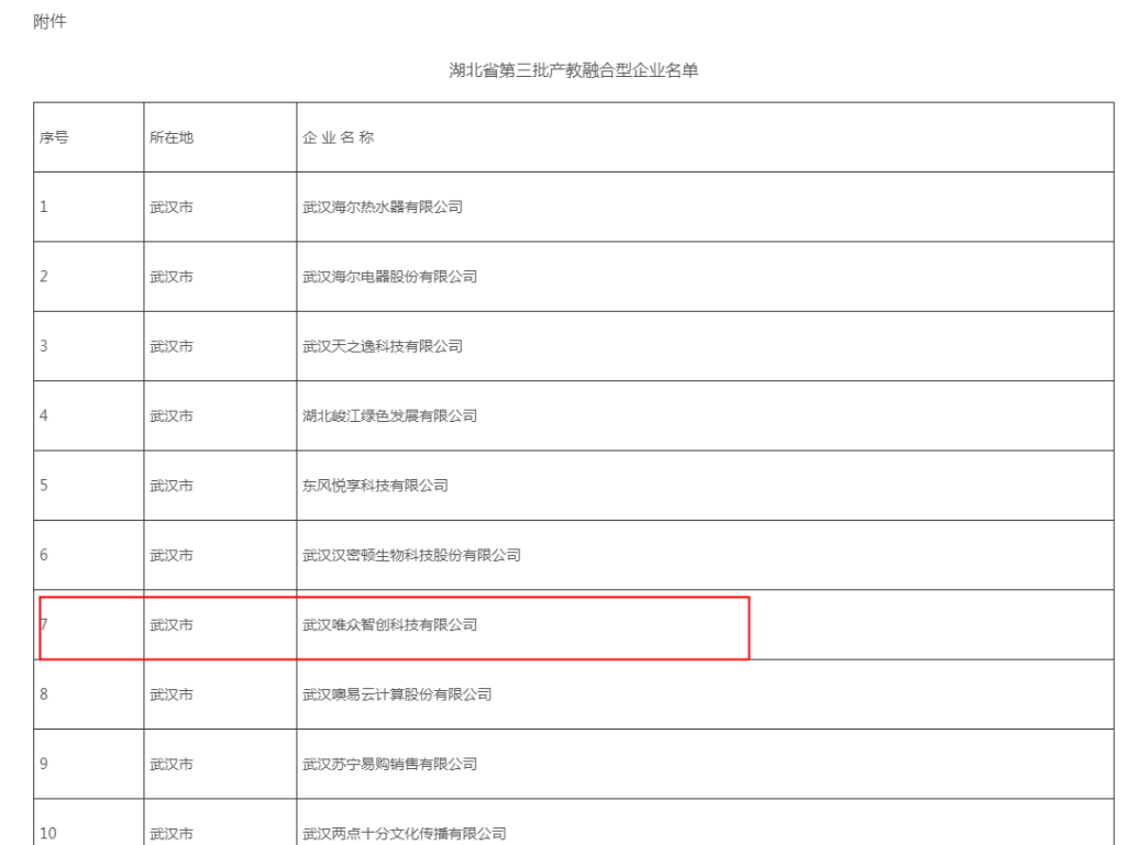 按照《国家发展改革委、教育部关于印发〈建设产教融合型企业实施办法(试行)〉的通知》(发改社会〔2019〕590号)和《湖北省建设产教融合型企业实施细则(试行)》(鄂发改社会〔2021〕124号)工作要求,省发改委、省教育厅、省经信厅、省人社厅等8部门对企业自荐、地方推荐的申请企业进行了信用审核、部门审核、专家审核,形成了湖北省产教融合型企业名单。武汉唯众智创科技有限公司凭借在全省产教融合发展方面的突出成绩入选。