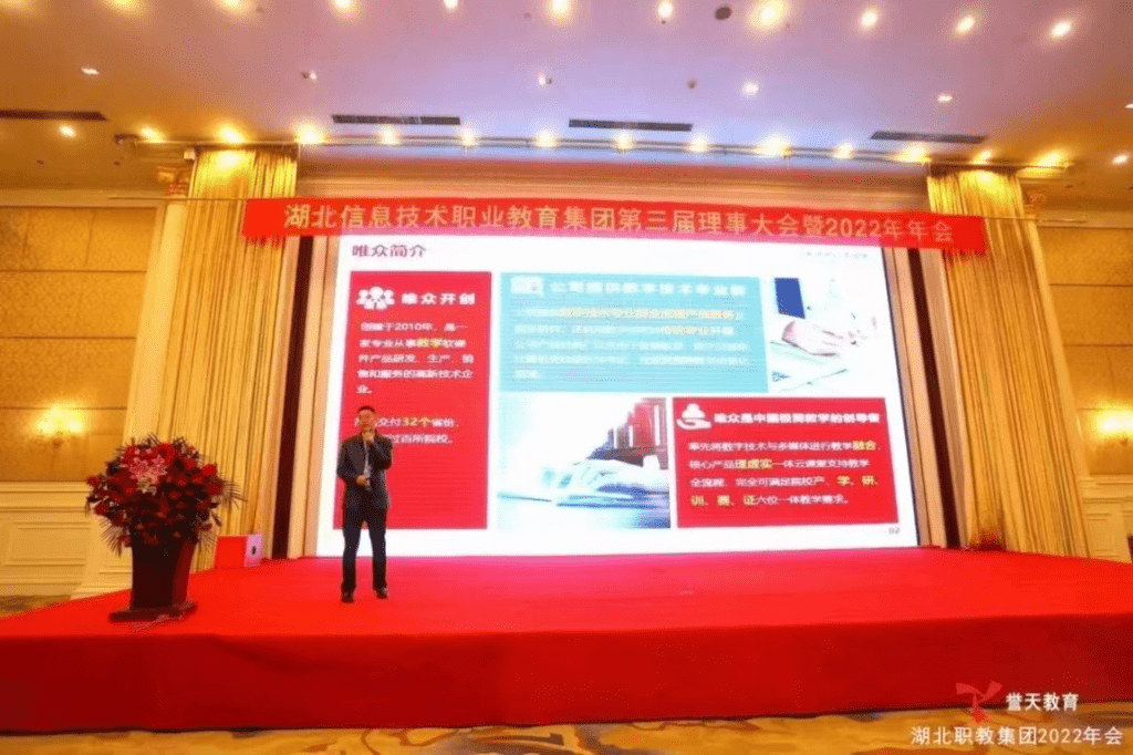 2023年3月18日,湖北信息技术职业教育集团第三届理事大会暨2022年年会在咸宁职业技术学院举办,武汉唯众智创科技有限公司作为副理事单位参加了本次年会。唯众董事长辜渝傧先生连续担任副理事长,总经理冉柏权先生担任常务理事,苏丹丹女士担任副秘书长。