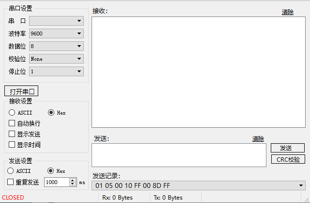 7.点击“关闭串口”, 状态变为“CLOSED”,“发送”变成灰色,“关闭串口”变成“打开串口”。