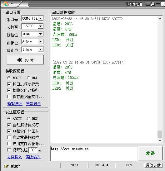 8.工作站电脑开启网络调试工具,ASCII码方式显示接收数据。