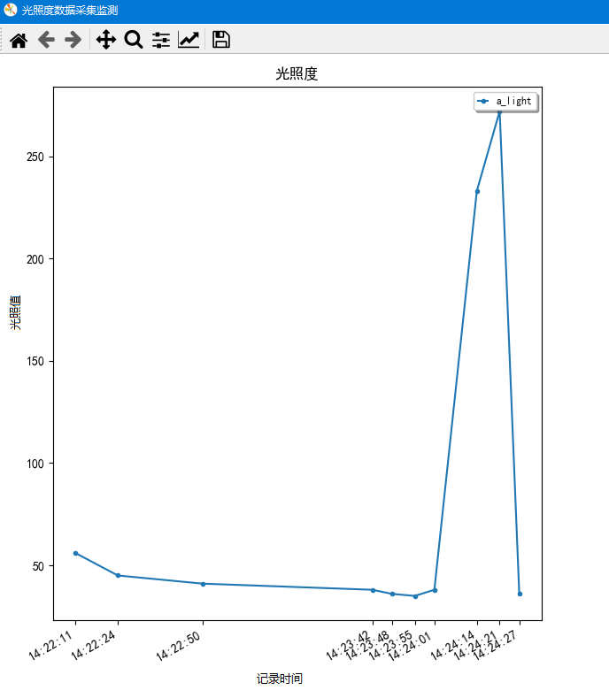 6.利用新安装的matplotlib组件包,将上表显示成折线图,折线图的横轴标注为记录时间,纵轴标注为光照值,参考如图: