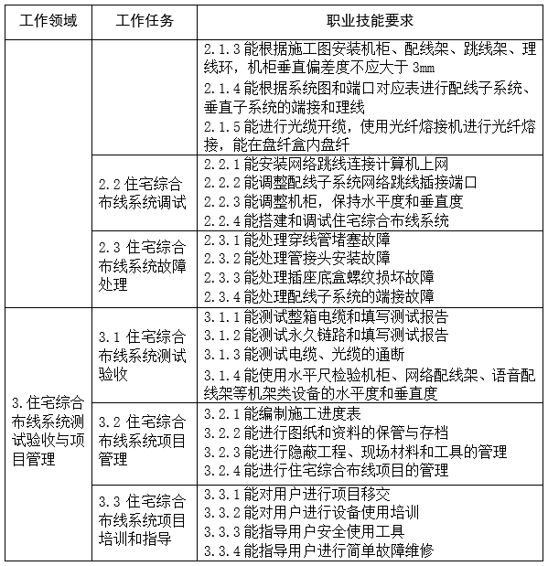 【综合布线系统安装与维护】(初级):主要面向网络工程公司、系统集成公司、建筑企业、企事业单位网络中心、政府部门、运营商等的网络安装施工和运维服务部门,从事教室、宿舍、阅览室、办公室、会议室、车间、商店、旅馆、小型公司等住宅建筑综合布线系统(配线子系统)的工作准备、项目安装调试与故障处理、项目测试验收与管理等工作,根据住宅建筑综合布线系统要求,完成住宅内综合布线系统安装与维护。