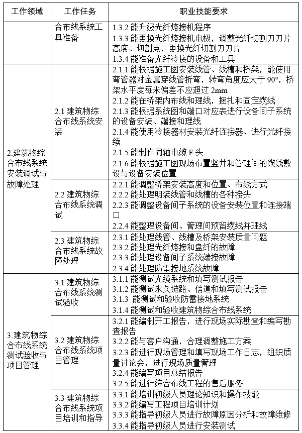 综合布线系统安装与维护职业技能等级分为三个等级:初级、中级、高级,三个级别依次递进,高级别涵盖低级别职业技能要求。