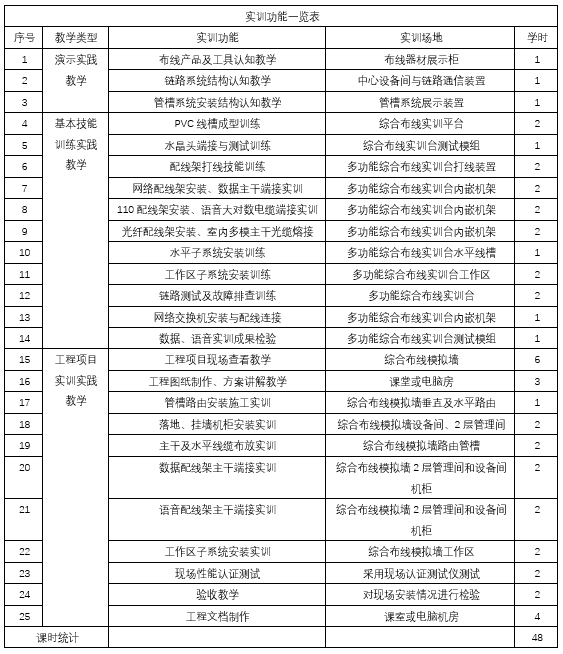 综合布线技术是一门理论与实践紧密结合的专业技能课,但在实际教学中,大多数学校实践教学部分较为薄弱,导致教学过程中理论课时大于实践课时,教师只能用视频来演示一些实验过程,学生不动手操作,很难理解网络综合布线系统项目设计、 预算编制、工程施工、质量监理、维护管理等 工作如何操作,毕业后达不到用人单位的需要。 所以建设一个高标准的网络综合布线实训室,提供一个具备综合布线工程预算、设计、 施工、测试、竣工整个流程的模拟施工现场实训环境,对教师的业务水平,学生的实践经验 的积累都有很大的帮助。在《教肓部等六部门关于实施职业院校技能型紧缺人才培养培训工程的通知》和《国务院关于大力推进职业教肓改革与发展的决定》的政策指导下,综合布线技术实训室就应运而生了。