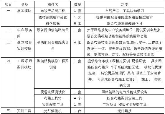 现有较为完善的综合布线实训室一般需要具备三部分的功能:即基础理论知识学习部分、基础技能实训部分和工程项目实践部分。基础理论知识学习部分提供各种资料、图像、录像、样品等,整体呈现综合布线系统工程所涉及的基础知识和产品展示;基础技能实训部分主要通过实训装置提供绐学生对各种布线产品的基本安装和操作的基础技能训练。工程实践部分分为实际工程顶目教学和糢拟工程顶目教学,相对于实际工程顶目这种实习型的教学,模拟工程顶目实践教学是在经过深化设计的模拟布线工程环境中,绐学生提供布线工程涉及的各个子系统和路由的设计、管理、安装等全方位的训练。