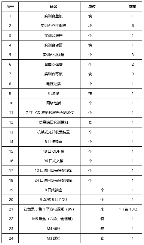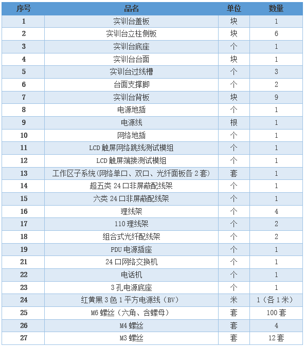 3) 设备中采用云数据数据中心布线、数据中心机房实际工程项目完全一致;各个训练功能和测试功能全部采用模组化设计,节约日后维护成本和教学成本;设备采用开放式机架设计,能满足3-5名学生同时实训,方便教学与实训。