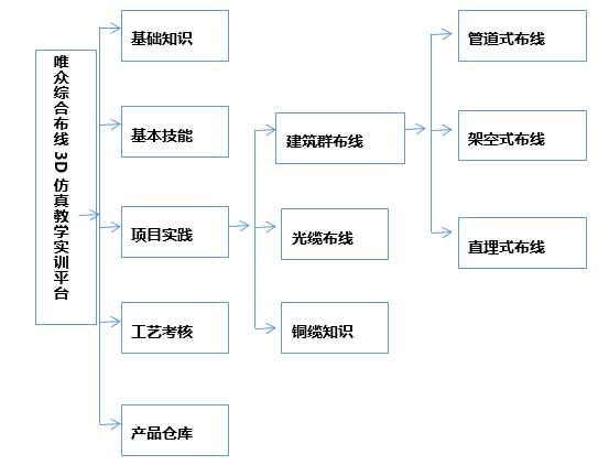 武汉唯众智创科技有限公司综合布线实训基地本着建成集“教、学、做”为一体的教学环境和校内生产性实训基地的理念,从演示实践教学、基本技能训练实践教学、工程项目实训实践教学三个层面为综合布线技术课程教学提供了整体实践教学解决方案,其基于综合布线工程工作过程的工程项目实训教学充分体现了职业教育的特点。