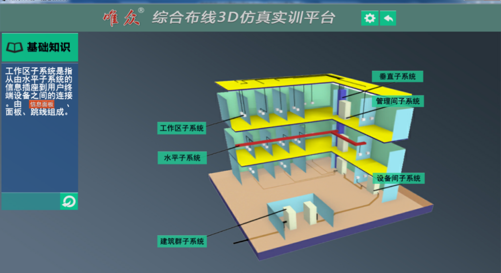 5)具有综合布线垂直系统、水平子系统、工作区子系统、设备间子系统等内容的展示功能
